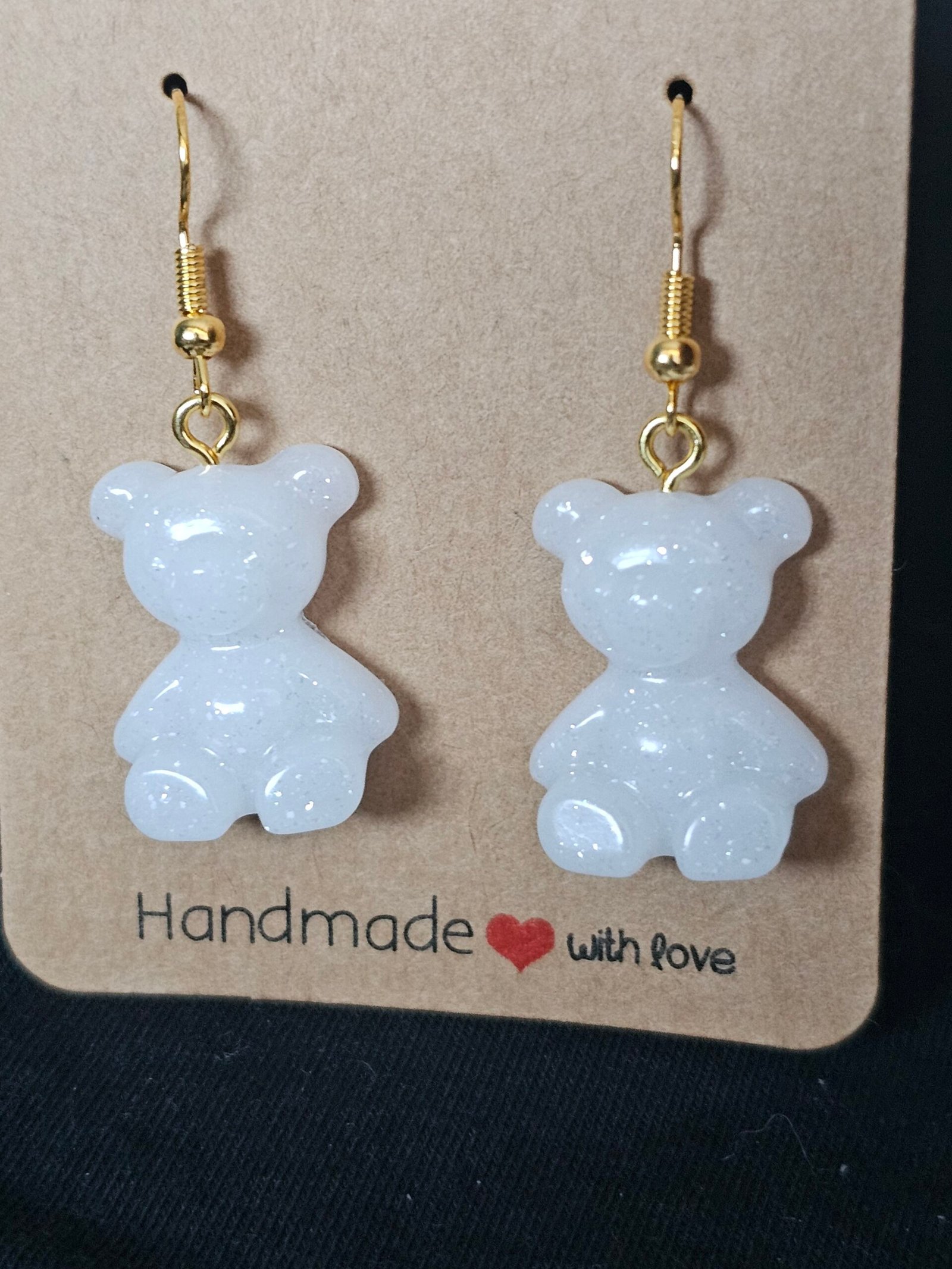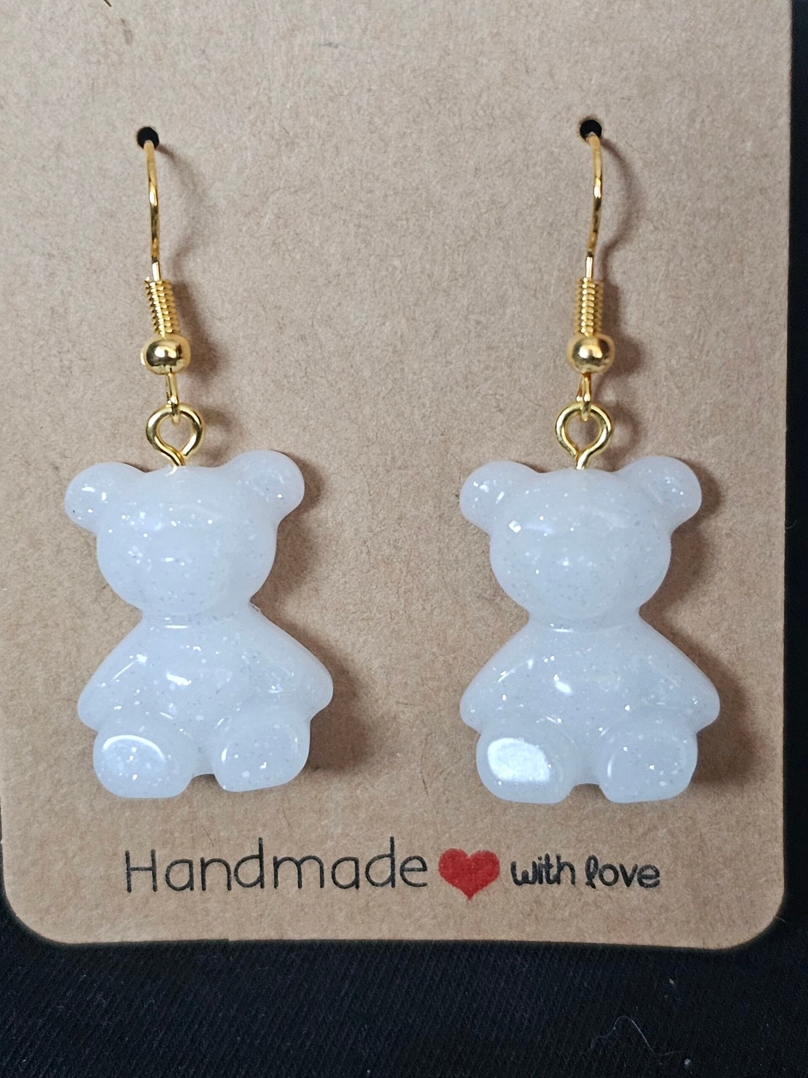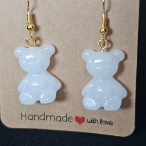 Handmade Resin Bear Earrings! Perfect gift or a treat for yourself. Cute and unique resin bears with gold accent hooks, white coloring, and glitter.